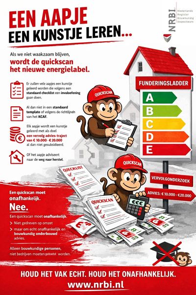 Tegelijkertijd groeit de zorg dat quickscans en vooronderzoeken te gemakkelijk verworden tot een standaard kunstje. Zeker nu in de markt opleiders en commerciële partijen actief zijn die mensen via formats, checklists en snelle certificering klaarstomen, zonder altijd voldoende bouwkundige kennis en praktijkervaring te toetsen. Stichting NRBI benadrukt daarom dat een quickscan alleen waarde heeft als deze onafhankelijk, deskundig en bouwkundig onderbouwd wordt uitgevoerd. Anders dreigt een woning onterecht een stempel te krijgen en “besmet” te raken in het koopproces.